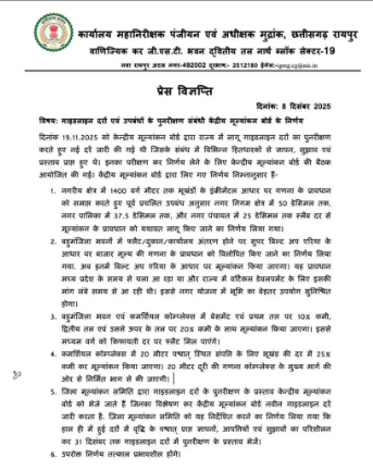 CG land guideline rates U-turn: बहुमंजिला भवनों में फ्लैट, दुकान और कार्यालय के अंतरण पर सुपर बिल्ट-अप एरिया के आधार पर बाजार मूल्य की गणना का प्रावधान हटा दिया गया। अब मूल्यांकन बिल्ट-अप एरिया के आधार पर किया जाएगा। यह प्रावधान मध्यप्रदेश शासन के समय से लागू था, जिसे बदलने की मांग काफी समय से की जा रही थी। नए प्रावधान से वर्टिकल डेवलपमेंट को तेजी मिलेगी और शहरी भूमि का अधिक प्रभावी उपयोग सुनिश्चित होगा।