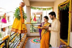 3. शुभ मुहूर्त में घर के बाहर गुड़ी (ध्वज) स्थापित करें और पूजा करें।